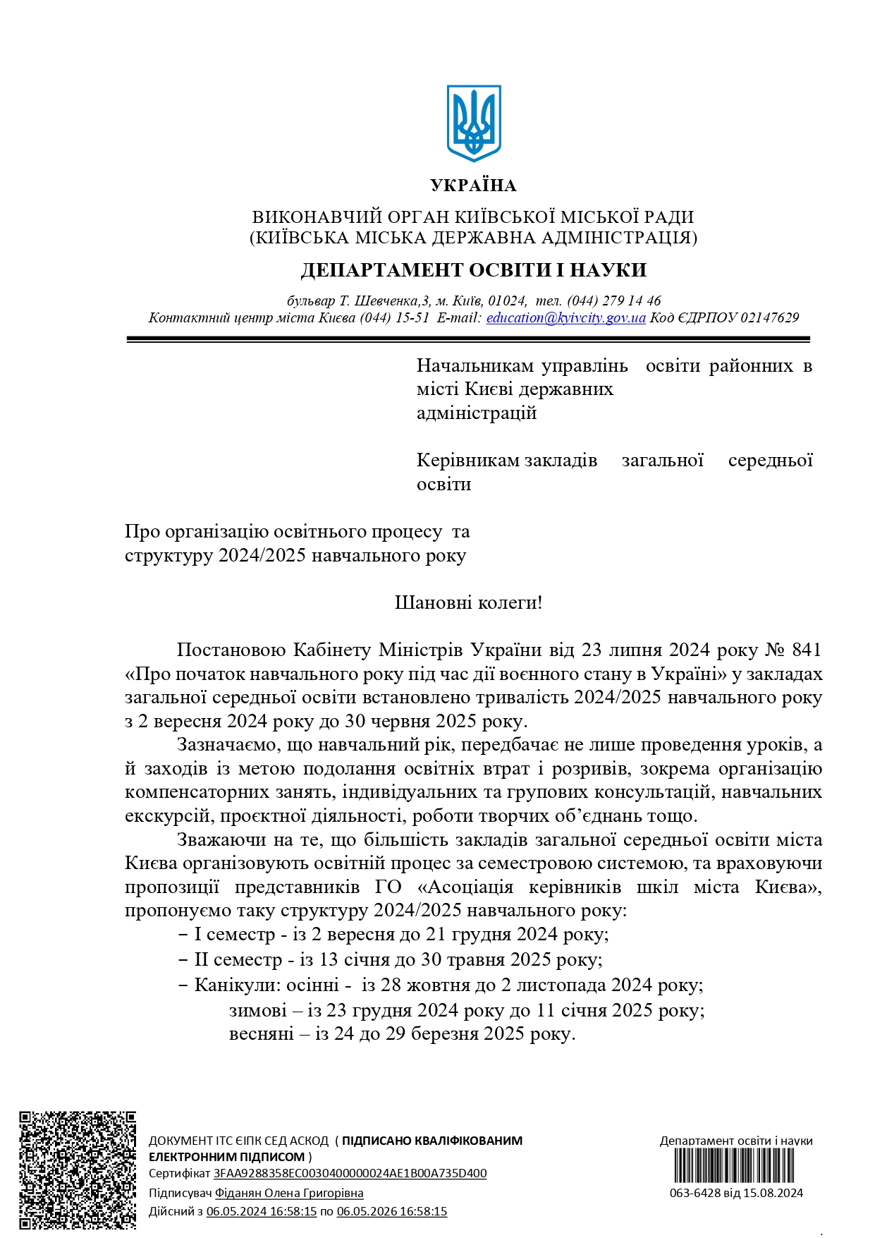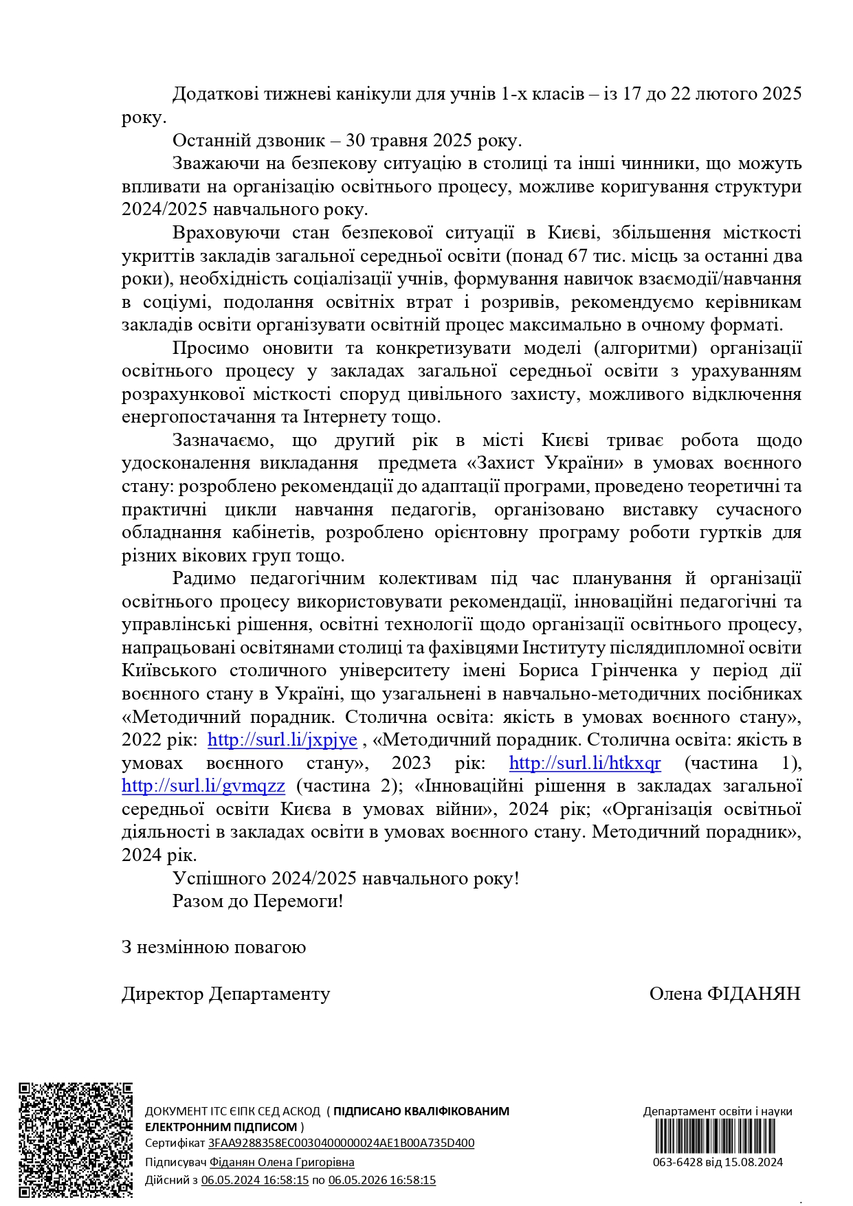 Навчальний рік 2024-2025: столичним школам рекомендується організувати освітній процес максимально в очному форматі