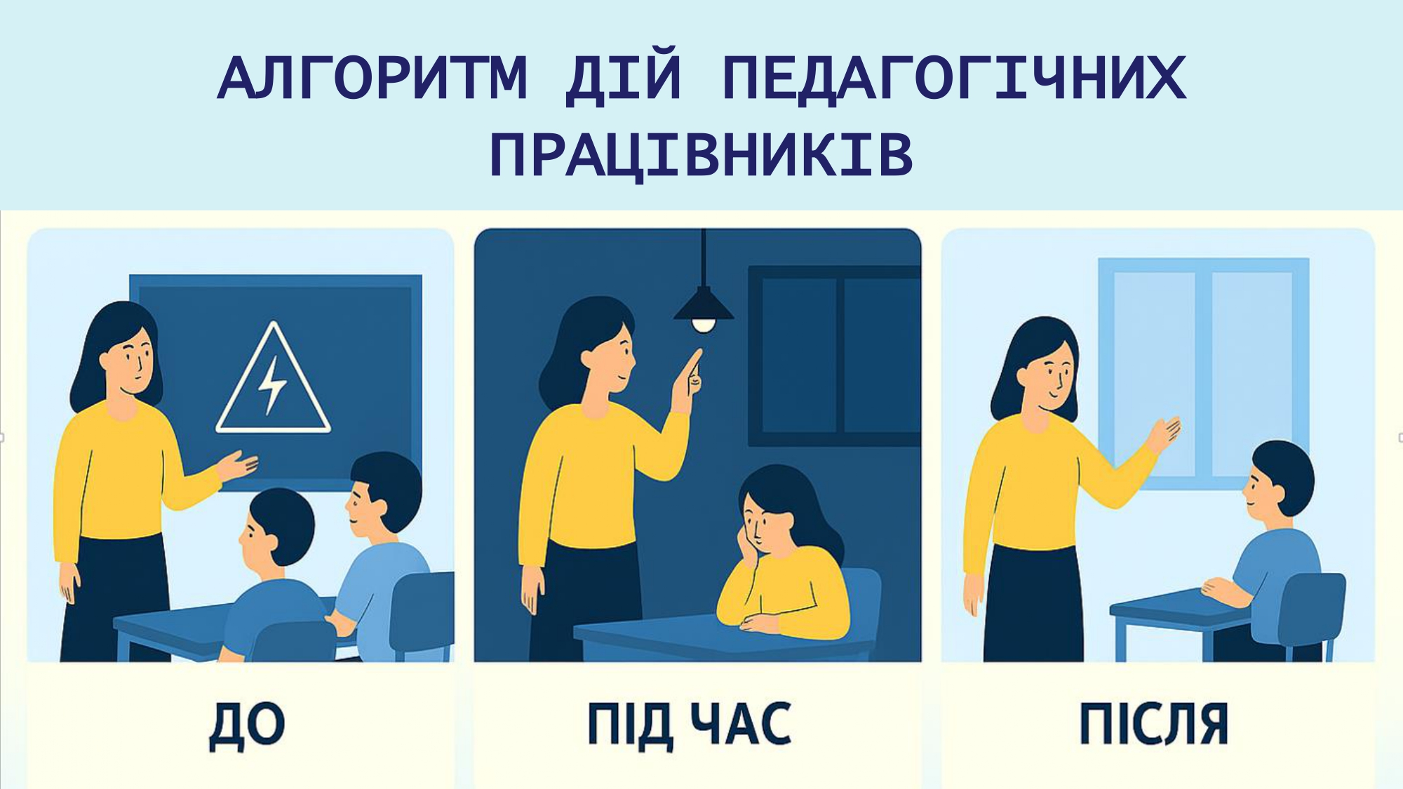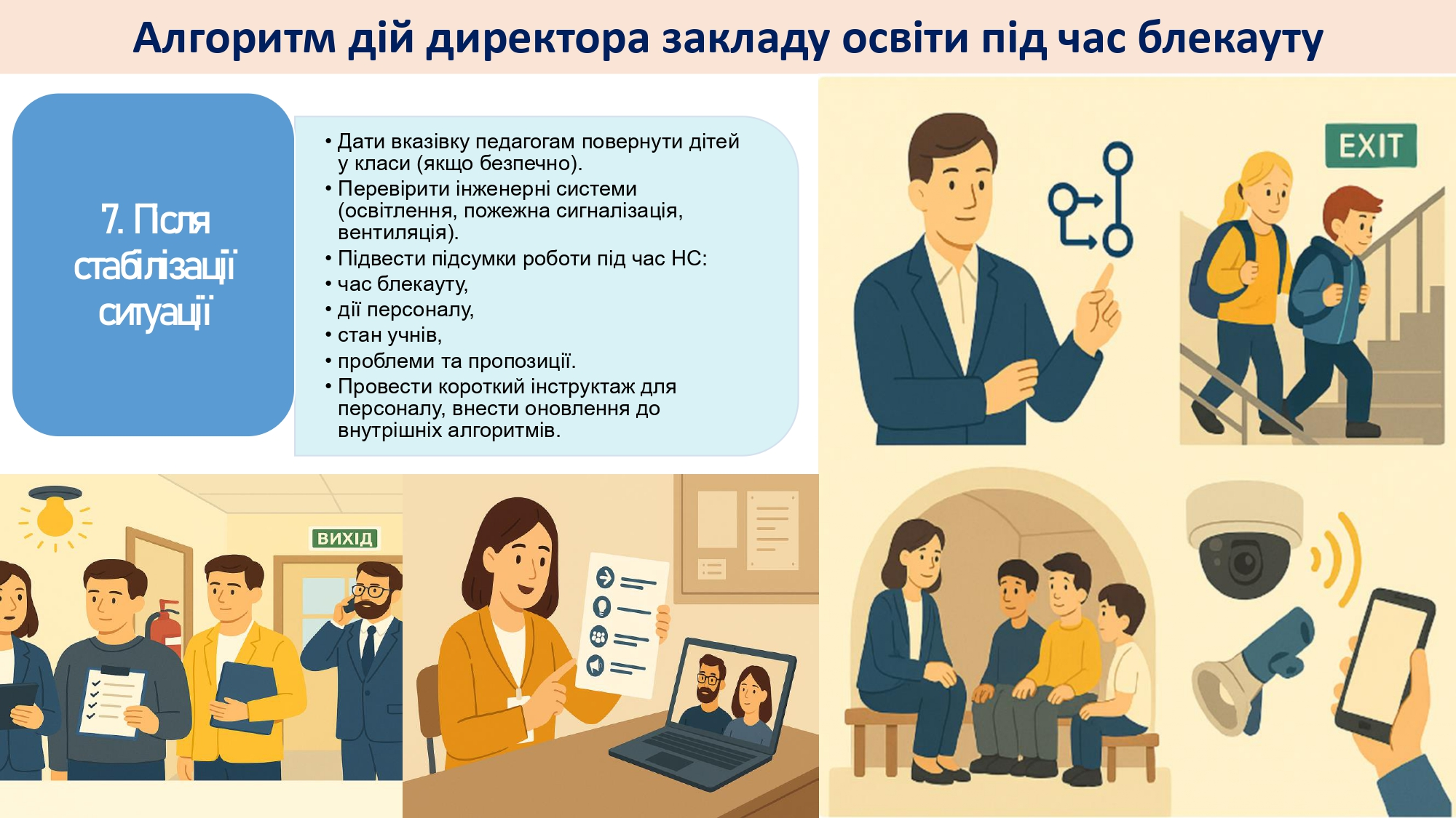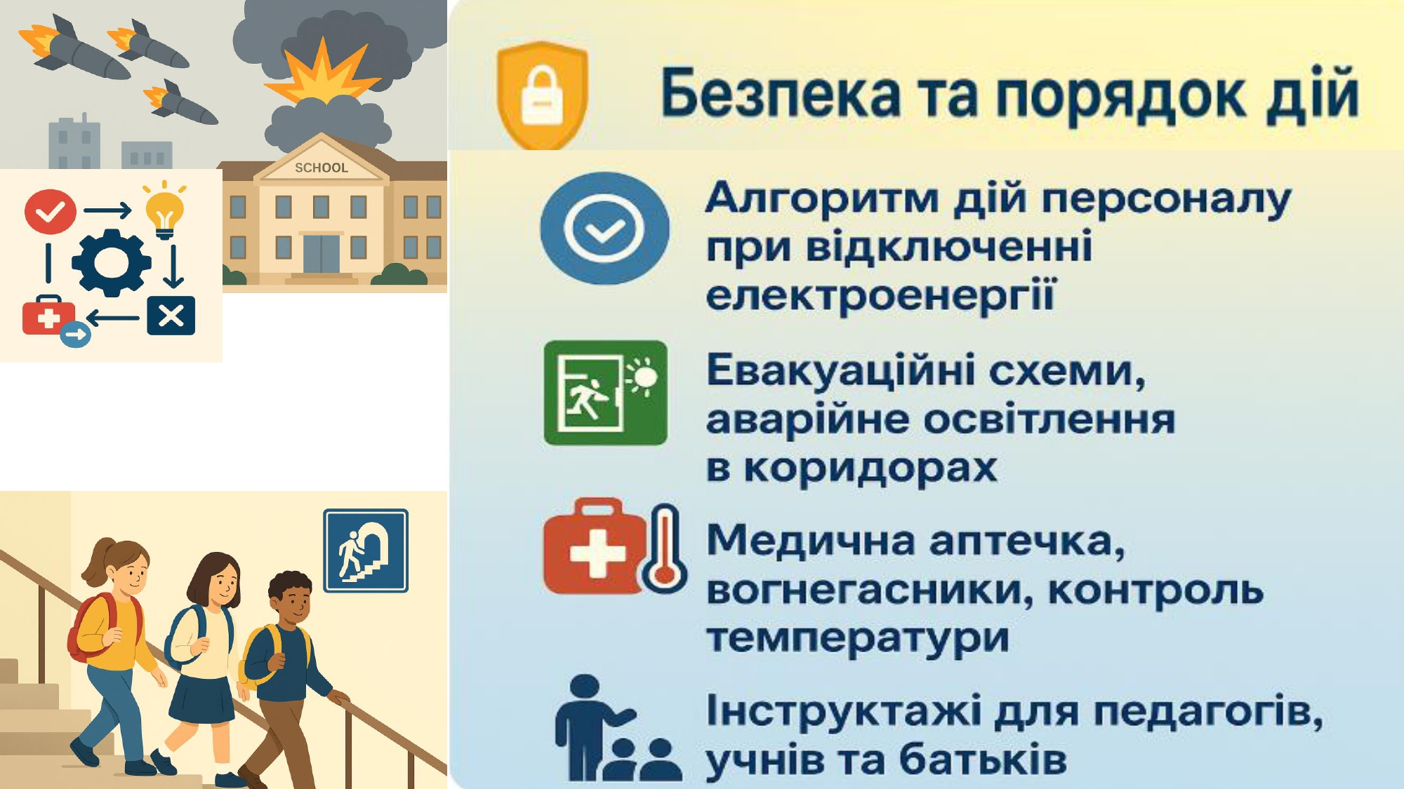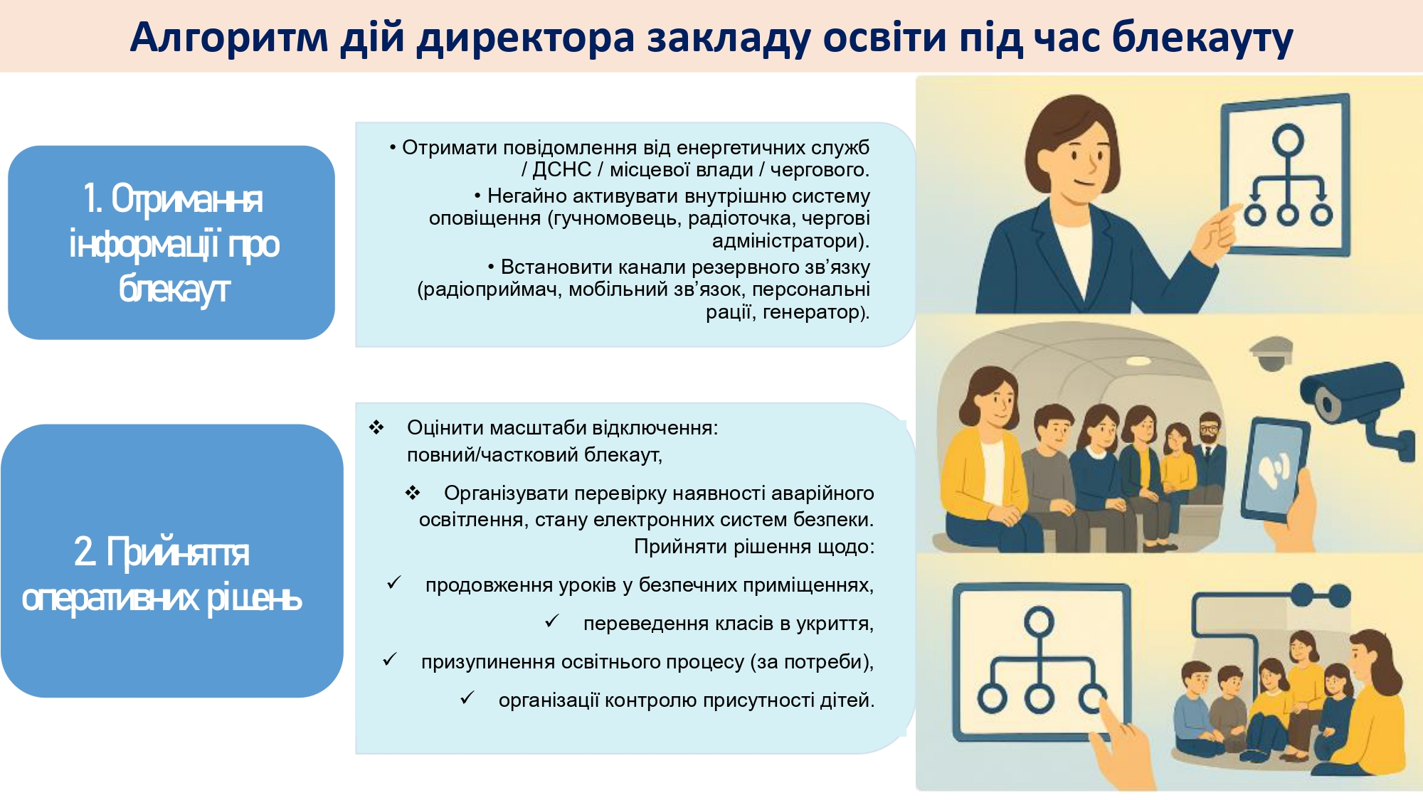 Кожен заклад освіти має орієнтовний освітній алгоритм дій у разі надзвичайних ситуацій, а також індивідуальні алгоритми, адаптовані під кожен конкретний заклад. Керівники шкіл мають організувати освітній процес так, щоб усі учні – незалежно від вибраного формату – отримували повноцінне навчання.