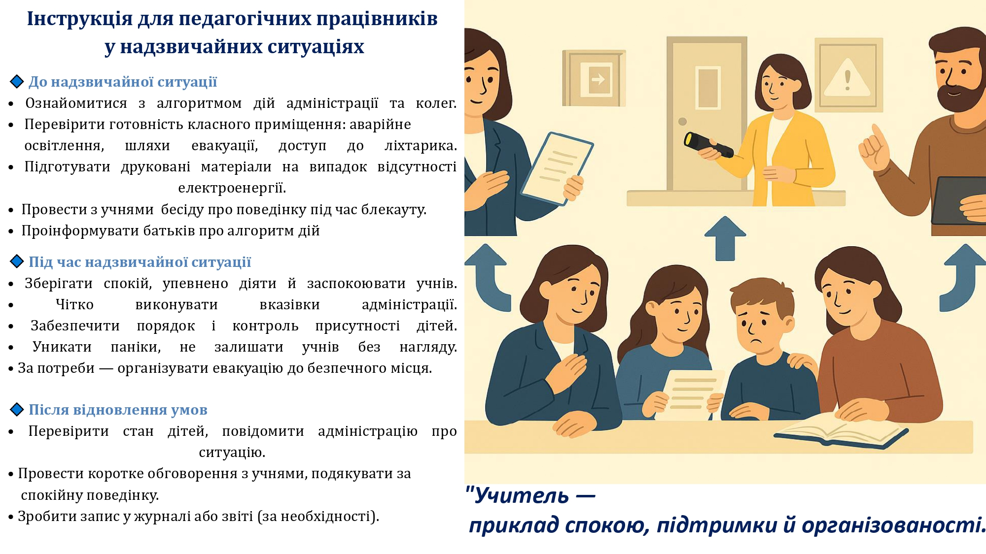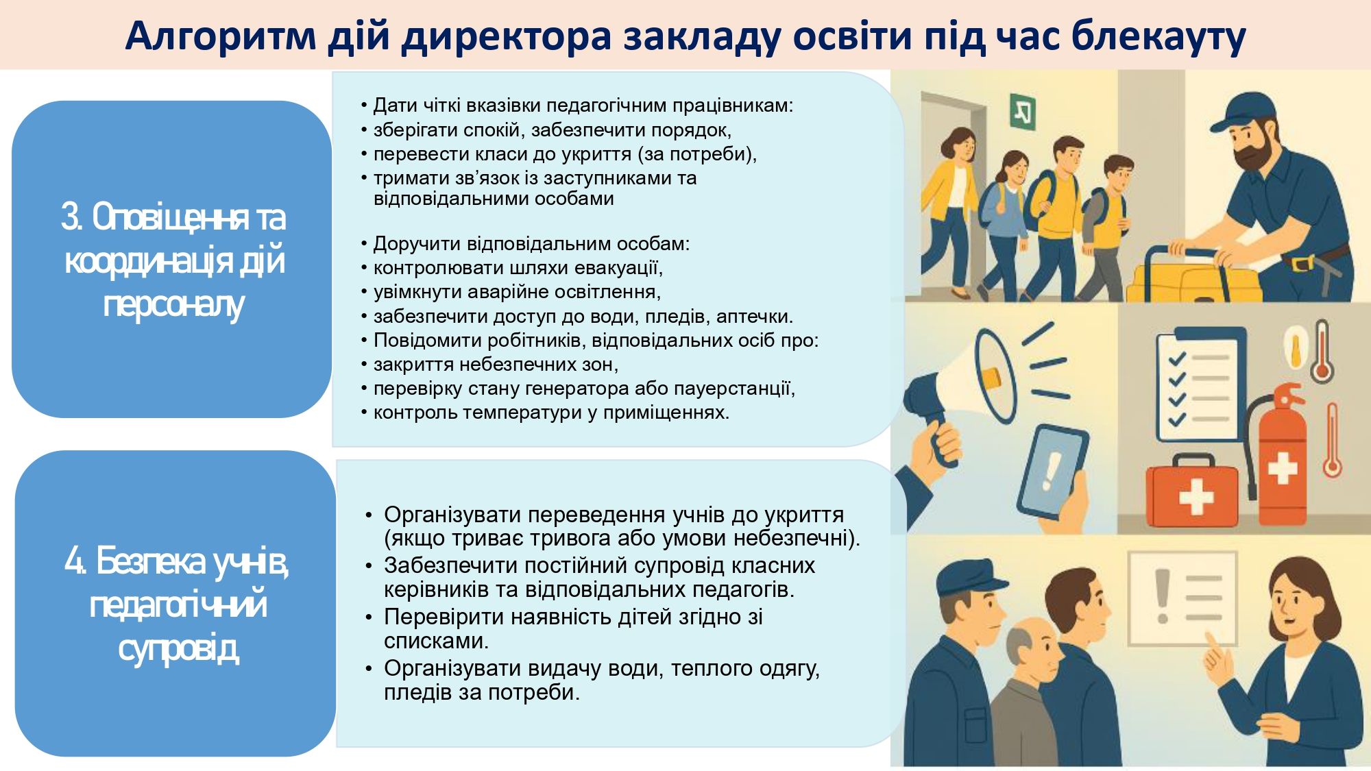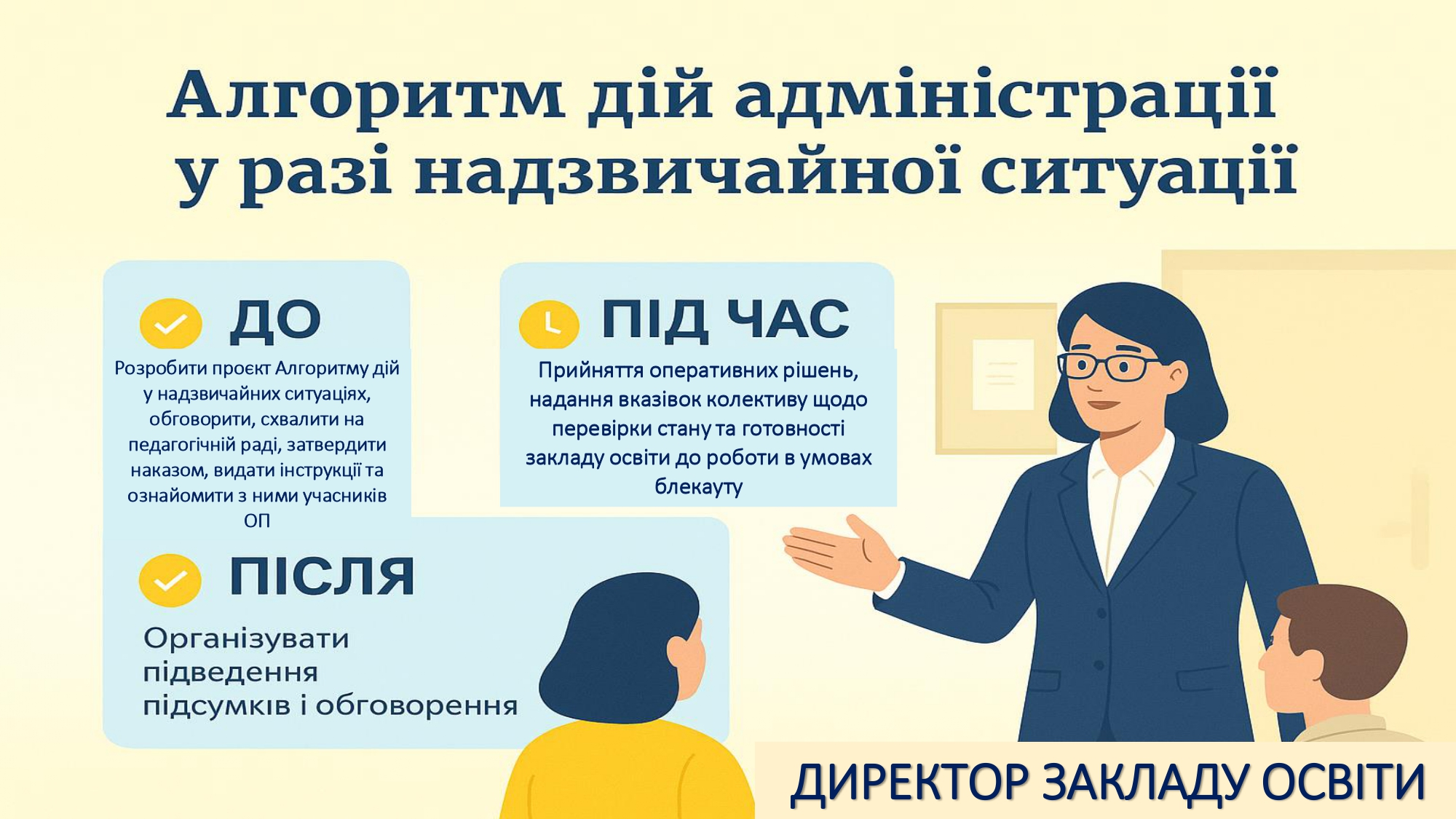 Кожен заклад освіти має орієнтовний освітній алгоритм дій у разі надзвичайних ситуацій, а також індивідуальні алгоритми, адаптовані під кожен конкретний заклад. Керівники шкіл мають організувати освітній процес так, щоб усі учні – незалежно від вибраного формату – отримували повноцінне навчання.