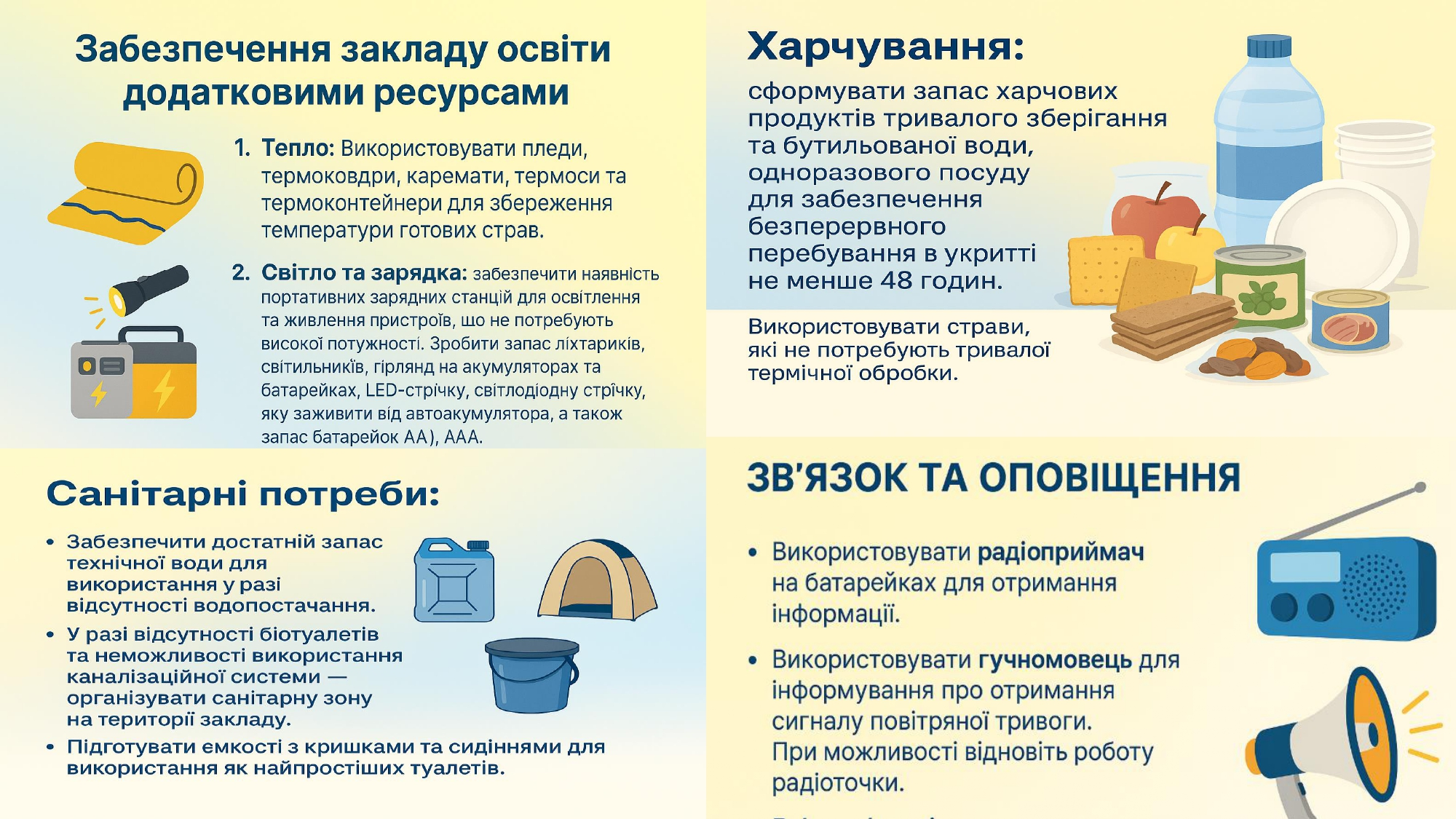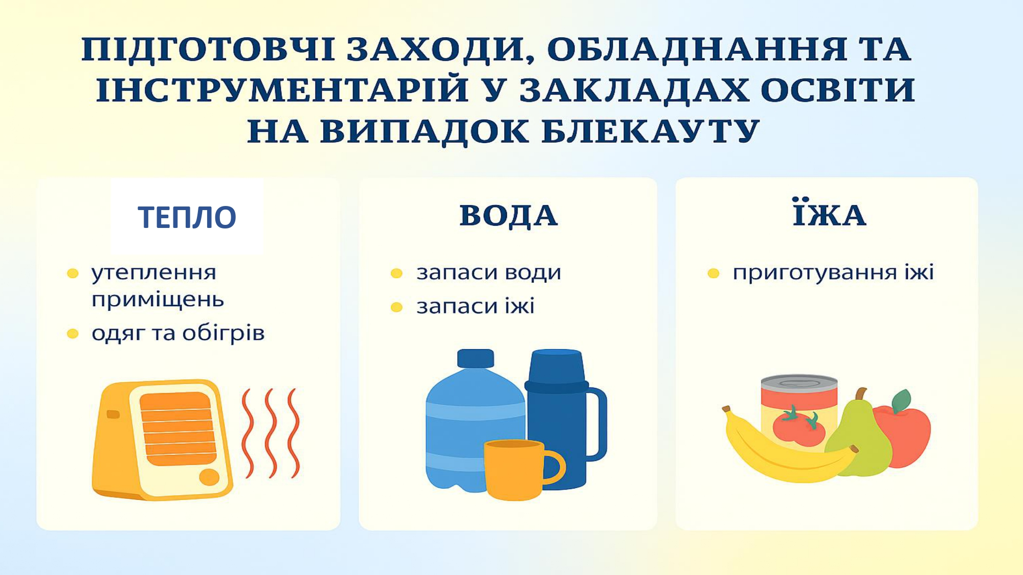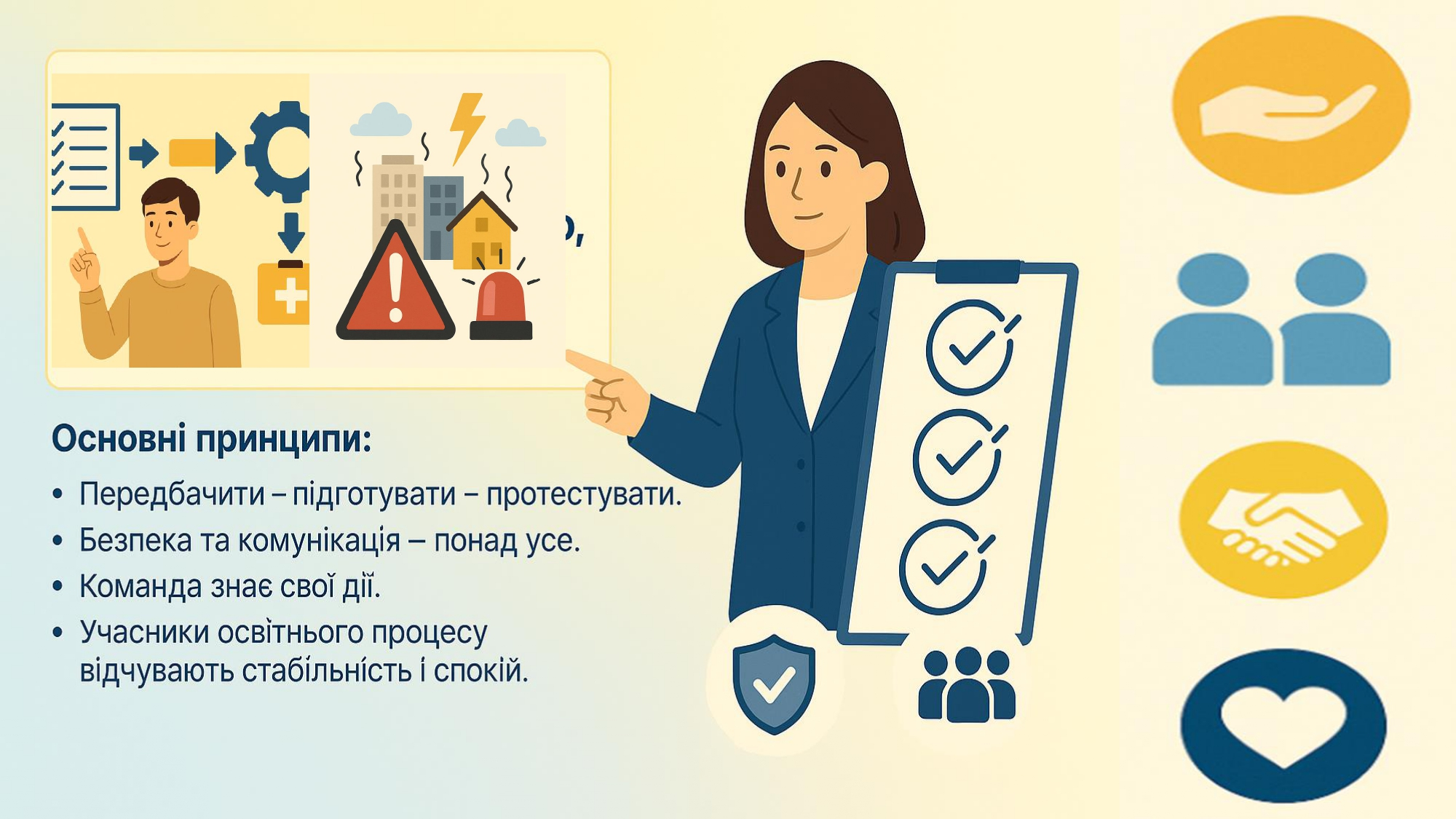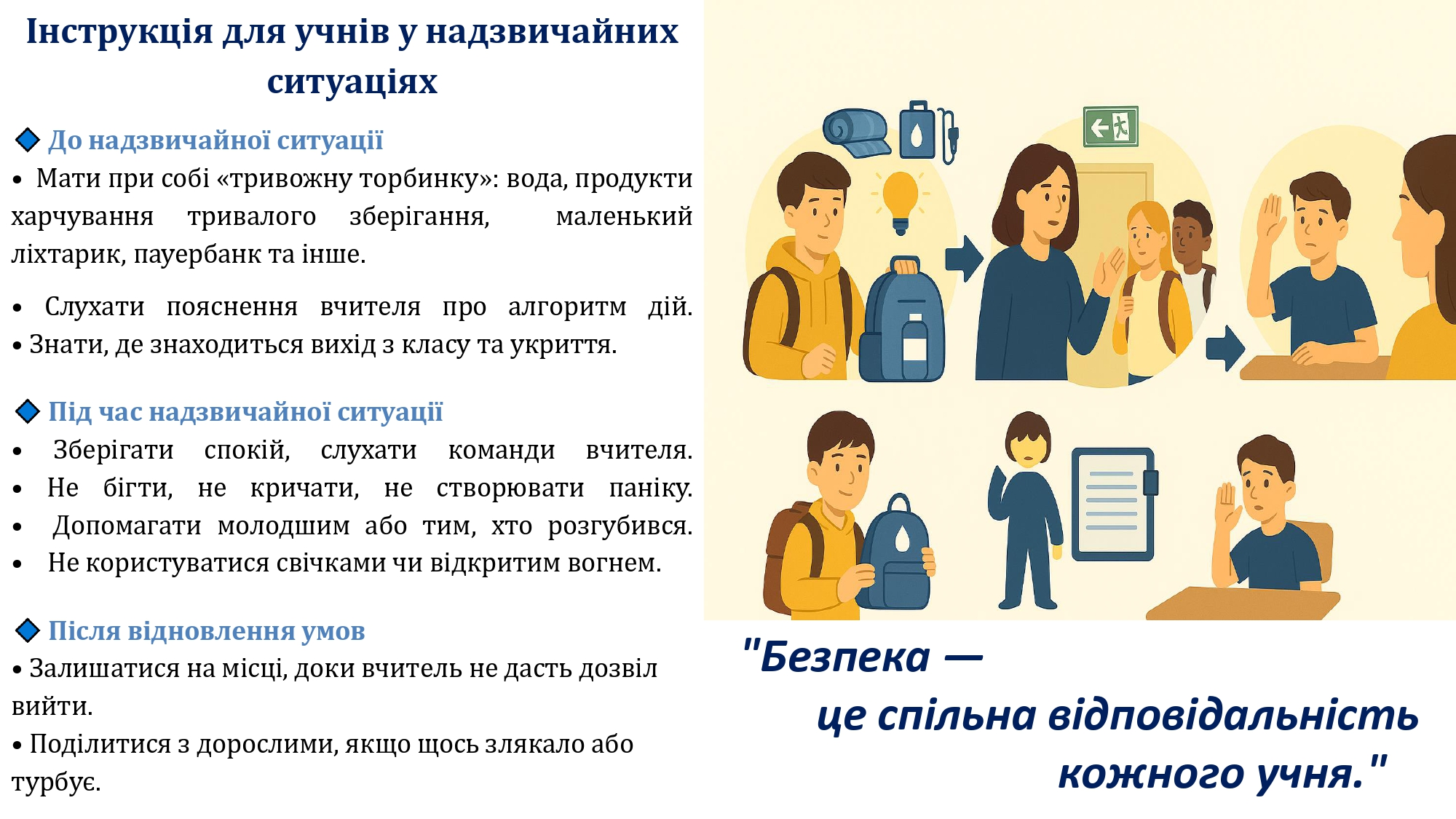 Кожен заклад освіти має орієнтовний освітній алгоритм дій у разі надзвичайних ситуацій, а також індивідуальні алгоритми, адаптовані під кожен конкретний заклад. Керівники шкіл мають організувати освітній процес так, щоб усі учні – незалежно від вибраного формату – отримували повноцінне навчання.