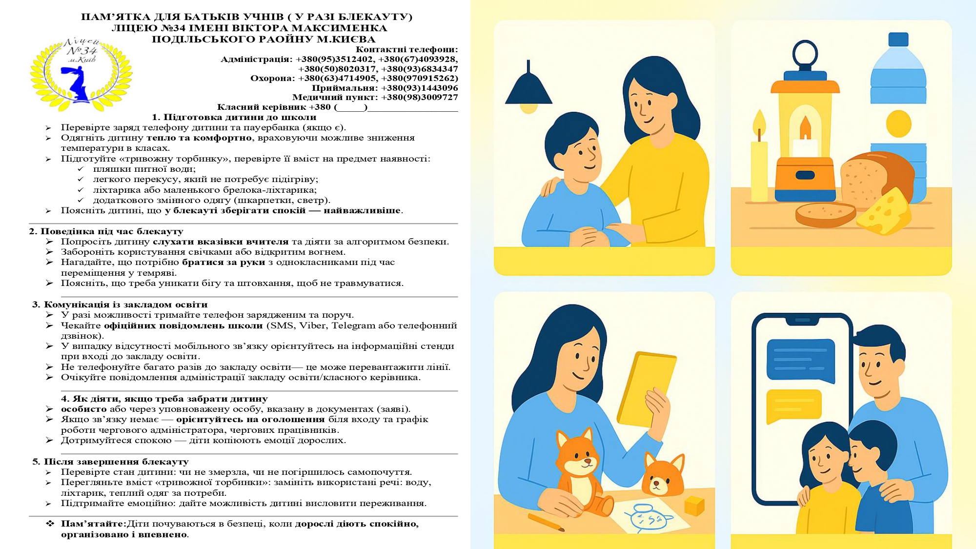 Батьків закликають тримати зв'язок з класними керівниками або іншими представниками закладів освіти, користуватися виключно офіційними київськими джерелами інформації – повідомленнями КМДА, Департаменту освіти та районних адміністрацій. Якщо батьки приймають рішення вести дітей до шкіл або садочків, просимо дотримуватись загальних рекомендацій: одягати дітей відповідно до погоди, враховуючи, що в закладах освіти може бути прохолодніше, переглядати склад «тривожної торбинки», довіряти офіційній інформації школи, бути на зв’язку у визначених месенджерах або групах.