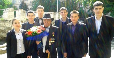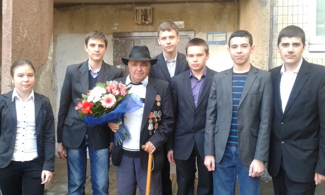 Учні 9-А класу СЗШ №4 та класний керівник Іванова Наталія Анатоліївна завітали з привітаннями до ювіляра. Ветеран розповів, як на початку війни 17-річним юнаком був вивезений до Східної Прусії на рабські роботи. З полону його звільнили радянські війська. Потім воював на Західних фронтах, перемогу зустрів у Польщі. Нагороджений багатьма орденами та медалями, але особливо пишається Грамотою від С.Будьоного.
