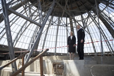 Віталій Кличко з пані послом США в Україні Бріджит Брінк оглянув відновлений скляний купол будинку вчителя, що був пошкоджений внаслідок вибуху російської ракети