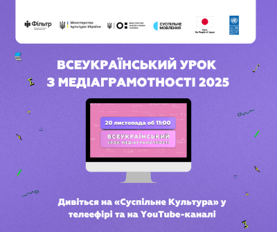 Всеукраїнський урок з медіаграмотності реалізовує Фільтр. Національний проєкт з медіаграмотності Міністерство культури України та Суспільне Мовлення за підтримки UNDP Ukraine / ПРООН в Україні та фінансування уряду Японії Посольство Японії в Україні / 在ウクライナ日本国大使館 / Embassy of Japan in Ukraine.